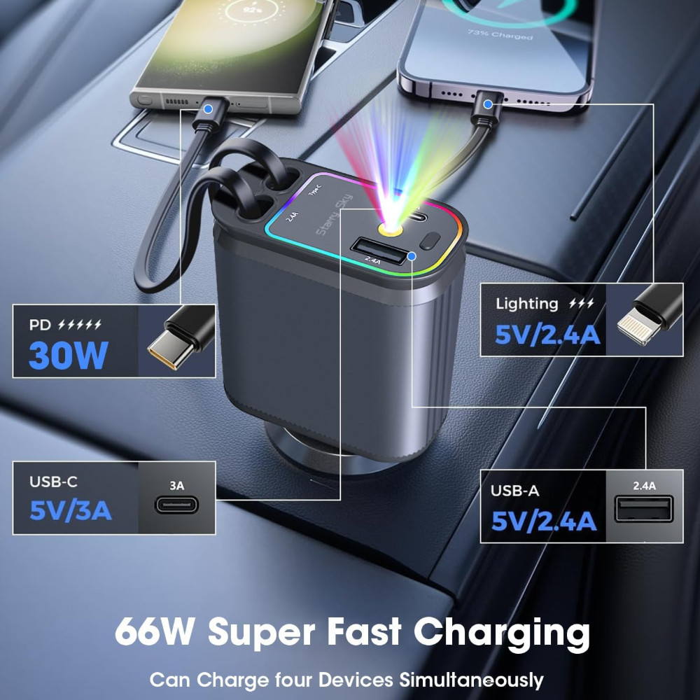 شارژر فندکی ۴ کاره ۶۶ واتی،نور لیزری کهکشانی و کابل جمع شونده استار اسکای starry sky