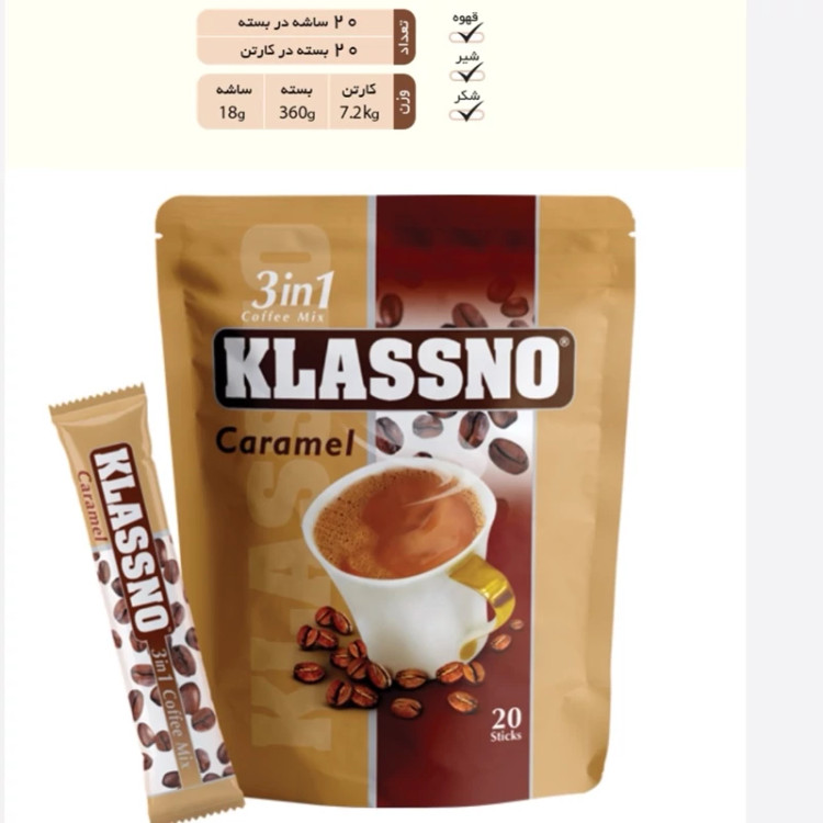 مجموعه قهوه های فوری 3 در 1 کلاسنو، طعمی متفاوت و دلنشین از ترکیب قهوه و شیر به همراه شکر ارائه می دهد.با این ترکیب، در هر کجا که هستید می توانید از طعم یک فنجان قهوه فوری عالی لذت ببرید. کافی میکس 3 در 1 کارامل با ترکیبی متفاوت و جذاب از قهوه و شیر کاراملی، شیرینی متعادل و سطح قابل قبول کافئین، برای شروع یک روز عالی پیشنهادی بی نظیر میباشد که بدون شک قلب و روح شما رو تسخیر میکند.