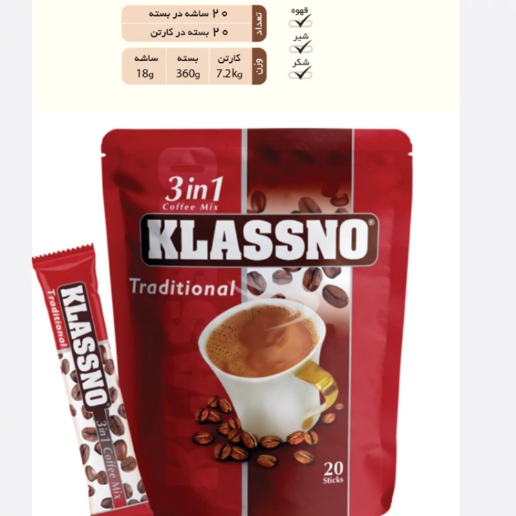 کافی میکس 3*1 تردیشنال مجموعه قهوه های فوری 3 در 1 کلاسنو، طعمی متفاوت و دلنشین از ترکیب قهوه و شیر به همراه شکر ارائه می دهد.با این ترکیب، در هر کجا که هستید می توانید از طعم یک فنجان قهوه فوری عالی لذت ببرید. کافی میکس 3 در 1 تردیشنال کلاسنو تمام انتظارات شما از یک قهوه فوری ملایم و خوش طعم را برای شما برآورده میکند. طعم سنتی قهوه در کنار عطری فوق العاده و دلفریب با ترکیبی دلپذیر از قهوه، شیر و شکر در انتظار شماست. نوش جان!