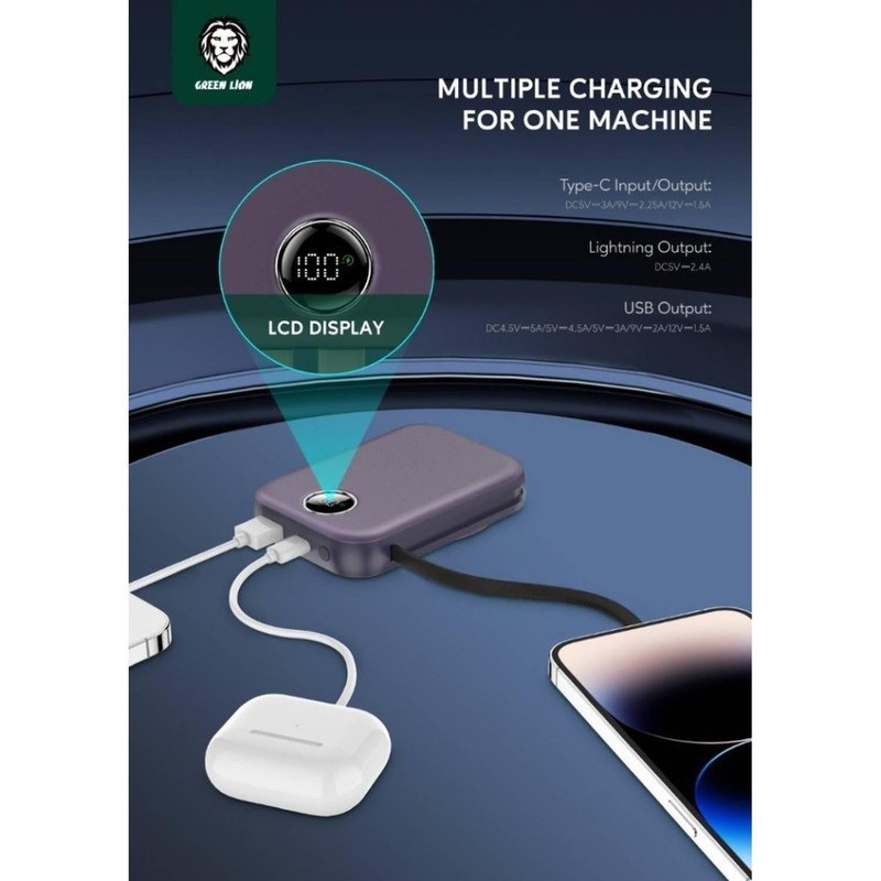پاوربانک Green Lion Monaco بهعنوان همراه شما وارد عمل میشود: به گوشیتان وصل میکنید، درصد شارژ آن بالا میرود، و در چند دقیقه بهطور چشمگیر شارژ میگیرد. ضمناً اگر آیفون یا گوشی دارای MagSafe دارید، تنها کافیست دستگاه را روی سطح مغناطیسی پاوربانک قرار دهید تا بدون کابل، شارژ شود. این راحتی و سرعت در کنار امکان بررسی درصد شارژ باقیمانده، تجربهای متفاوت از شارژ همراه در اختیار شما میگذارد.