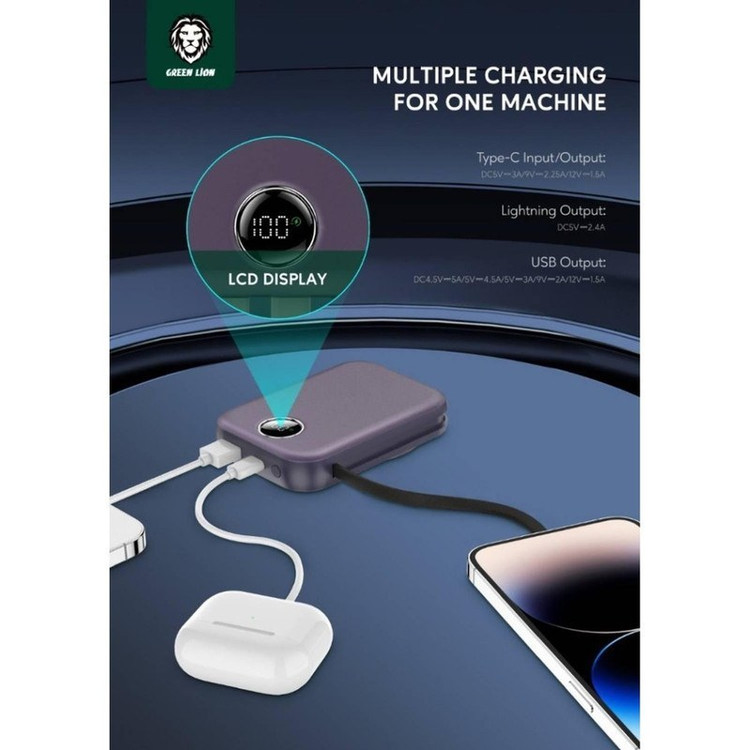پاوربانک Green Lion Monaco ظرفیت ۱۰ ۰۰۰ mAh انتخابی هوشمند و همهکاره برای کسانی است که روزانه با تلفن همراه، تبلت یا هدفون بیسیم سروکار دارند. این مدل با پشتیبانی از شارژ سریع سیمی و بیسیم، ساختاری جمعوجور و نمایشگر LCD میزان شارژ باقیمانده، ترکیبی عالی از عملکرد، طراحی و ایمنی را ارائه میدهد. در وبسایت رسمی Green Lion آمده است که این محصول دارای خروجی بیسیم مغناطیسی MagSafe تا توان ۱۵ وات، خروجی USB-C با شارژ سریع و بدنه مقاوم از ترکیب ABS + PC میباشد.